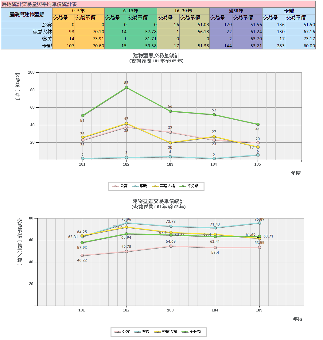 本功能得客製化統計圖表,並依不同次市場,以圖表分年統計交易量及均價,視覺化展現各次市場價量差異及走勢圖。以房地為例,可依年度展現不同屋齡、建物型態之交易量及均價(如圖4),提升資訊參考價值及解讀效率,協助解讀海量實價資訊,讓查詢者見樹也見林。