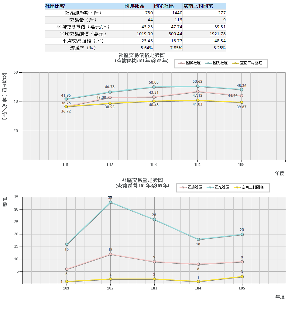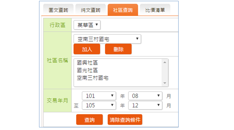 本功能提供大社區101年8月實價登錄以來歷年完整資料,社區所有交易案例一網打盡!除單一社區交易案件之查詢外,更提供至多3個社區價量統計資料圖表進行交叉比較(如圖1),同時更可依使用者需求輸入查詢期間,進行各社區總戶數、交易量、交易價格趨勢等價量資訊統計(如圖2),讓尋屋比價更便利!