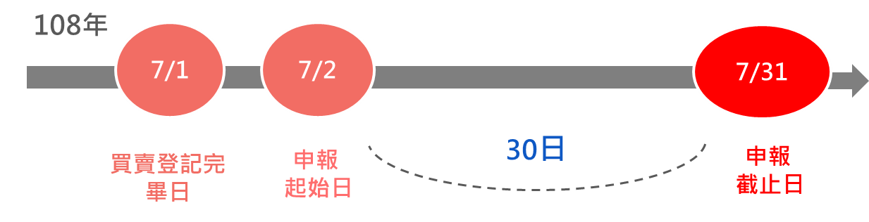 買賣案件由地政士送件者由地政士申報;如非屬地政士送件者則由權利人(即買受人)申報,買賣移轉登記完畢之次日起30日內應依規定申報實價登錄案件。期限範例如下: