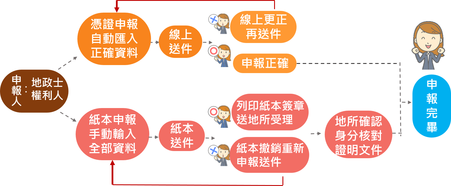 申報代理人以自然人憑證進行驗證申報,可由系統帶入大部分資料,正確性高且免至地所送件,建議申報可多加利用;點選「表單登錄,紙本送件」選項申報者,則需列印2份申報書紙本簽章並攜帶申報人身分證明文件至地所收件才能完成買賣申報 。