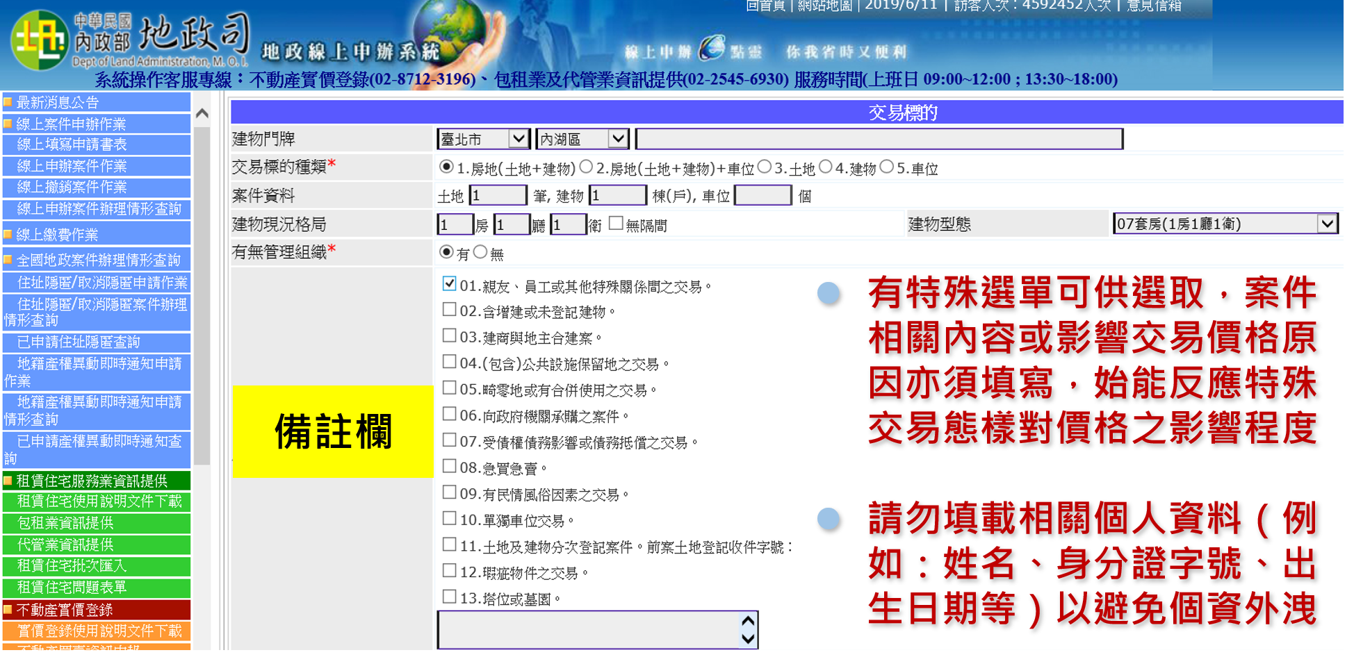 為反應特殊交易態樣對價格的影響程度,如果是屬於特殊交易案件,像是親友間買賣、特殊交易事宜或其他影響交易價格(如雙方合意解除契約、買賣土地交易價格總價含土地未保存登記建物)等,則於備註欄填載,但相關個人資料(例如:姓名、身分證字號、出生日期等)則請勿填載,以避免個資外洩。