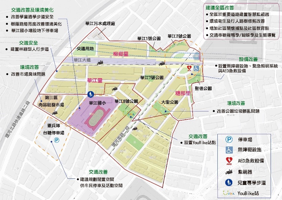 華江地區在交通旅遊方面,有社區車位不足及大眾運輸便利性不足等議題,另居民希望能將堤外的華江雁鴨自然公園與華江地區加以串連,提升交通可及性;生態環境方面,因居民飼養寵物隨地大小便,造成區內蚊蟲孳生、衛生環境不佳;安全方面,區內樹蔭遮蔽路燈,通學步道夜間照明亮度不佳,產生治安疑慮;健康生活方面,因區內老年人口眾多,有增設活動聚會場所需求。社區創生議題,居民希望社區能夠導入智慧路燈、緊急通報按鈕、AED及監視影像立即看等智慧應用,並且配合萬華社大課程,於華江地區建置社區教育點,方便居民就近學習進修。(圖4)