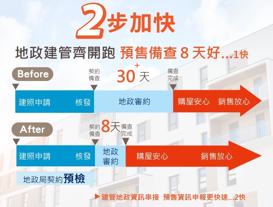 地政局全國首創讓預售屋業者在請建照後同步申請預檢服務,在等待建照核發的同時依照地政局檢查結果修正預售契約,未來正式申報備查時間30天變8天。地政局特別提醒業者在申請建照後及早申請預檢,才能享受快速的備查服務。