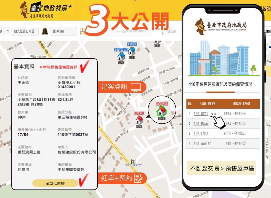 為了即時、正確揭露預售屋銷售資訊,保障消費權益,地政局自3月22日起推出「預售建案一二三 訂購簽約很心安」三步攻略,期望能達到安居臺北、宜居臺北的目標與願景。