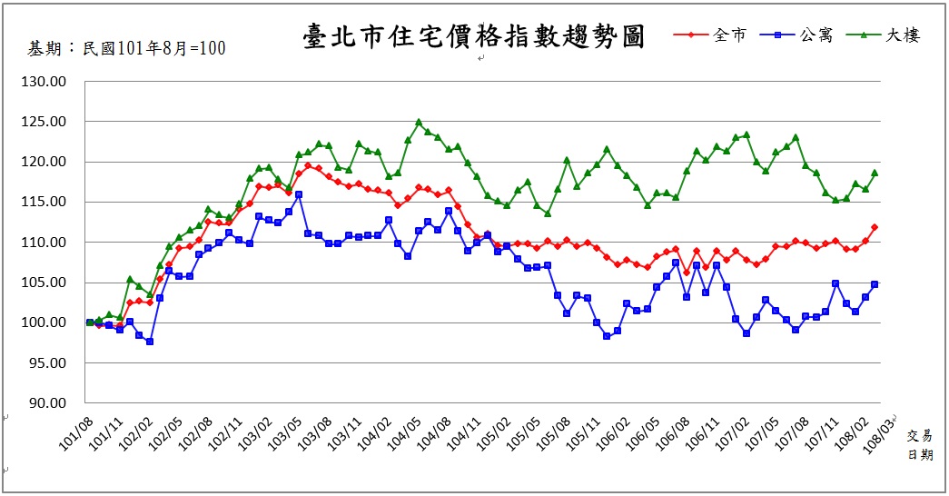 108年3月全市住宅價格指數111.89,較2月110.13上升1.60%,標準住宅總價1,400萬元,標準住宅單價每坪51.49萬元。大樓住宅價格指數118.53,較2月116.50上升1.74%;公寓住宅價格指數104.76,較2月103.21上升1.50%。