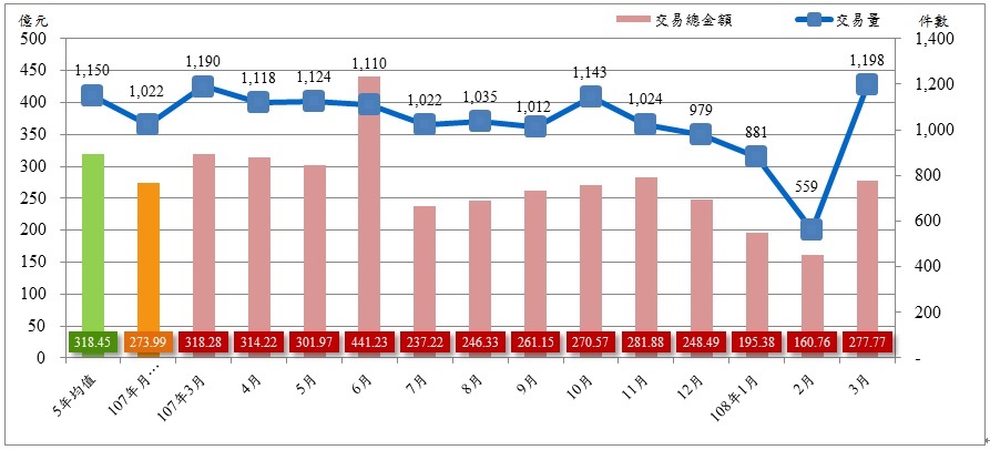 108年3月實價登錄量價動態,全市交易量共1,198件,較2月559件增加639件,增幅114.31%;交易總金額為277.77億元,較2月160.76億元增加117.01億元,增幅72.79%。