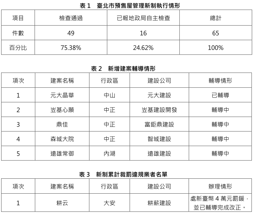 臺北市於106年3月1日正式推出預售屋管理新制,主要四大內容為一、自主檢查;二、公會預審;三、隨時稽查;四、即時公布。截至106年12月底止,該期間市場銷售之預售建案已全數納管(尚無未配合新制之業者) ,其中,經地政局輔導完成為49件建案,另已報請地政局自主檢查中為16件,總計納管65件建案,較上月增加5件,增幅8.33% (表1及表2),地政局並就輔導完成建案逐案實地複查,複查結果計1件建案不合格,業已裁處新臺幣4萬元整(表3)。