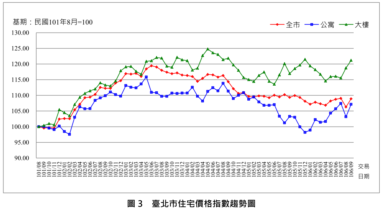 9月全市住宅價格指數108.92,較8月106.29上漲2.47%,較去年同期(105年9月109.36)下跌0.40%,標準住宅總價1,363萬元,標準住宅單價每坪50.12萬元。大樓住宅價格指數121.20,較8月118.74上漲2.07%,較去年同期116.96上漲3.63%。公寓住宅價格指數107.14,較8月103.19上漲3.83%,較去年同期103.29上漲3.73% (圖3)。9月全市住宅價格月線上漲帶動季線及半年線止跌回升;公寓月線反彈向上帶動季線、半年線同步走升;大樓連續2個月月線、季線及半年線均呈上漲,續揚趨勢不變,細部分析於--臺北市不動產市場動態月報中有充分說明。