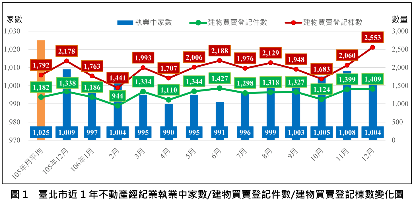 106年12月建物買賣登記件數1,409件,較上月1,399件增加10件,增幅0.71%,較去年同期1,338件增加71件,增幅5.31%,較去年平均1,182件增加227件,增幅19.20%;而建物買賣登記棟數12月2,553棟,較上月2,060棟增加493棟,增幅23.93%,較去年同期2,178棟增加375棟,增幅17.22%,較去年平均1,792件增加761棟,增幅42.47% (圖1)。