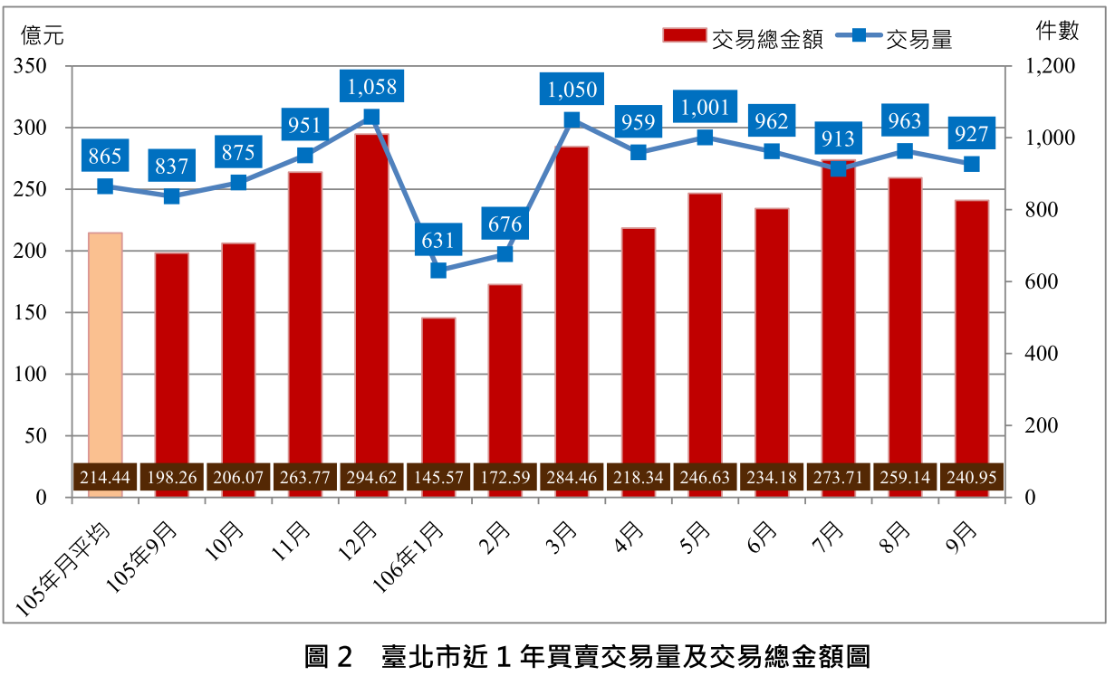 最近一期(106年9月)實價登錄量價動態,全市交易量共927件,較8月963件減少36件,減幅3.74%,較去年同期837件增加90件,增幅10.75%,較去年平均865件增加62件,增幅7.17%。交易總金額為240.95億元,較8月259.14億元減少18.19億元,減幅7.02%;較去年同期198.26億元增加42.69億元,增幅21.53%,較去年平均214.44億元增加26.51億元,增幅12.36% (圖2) 。
