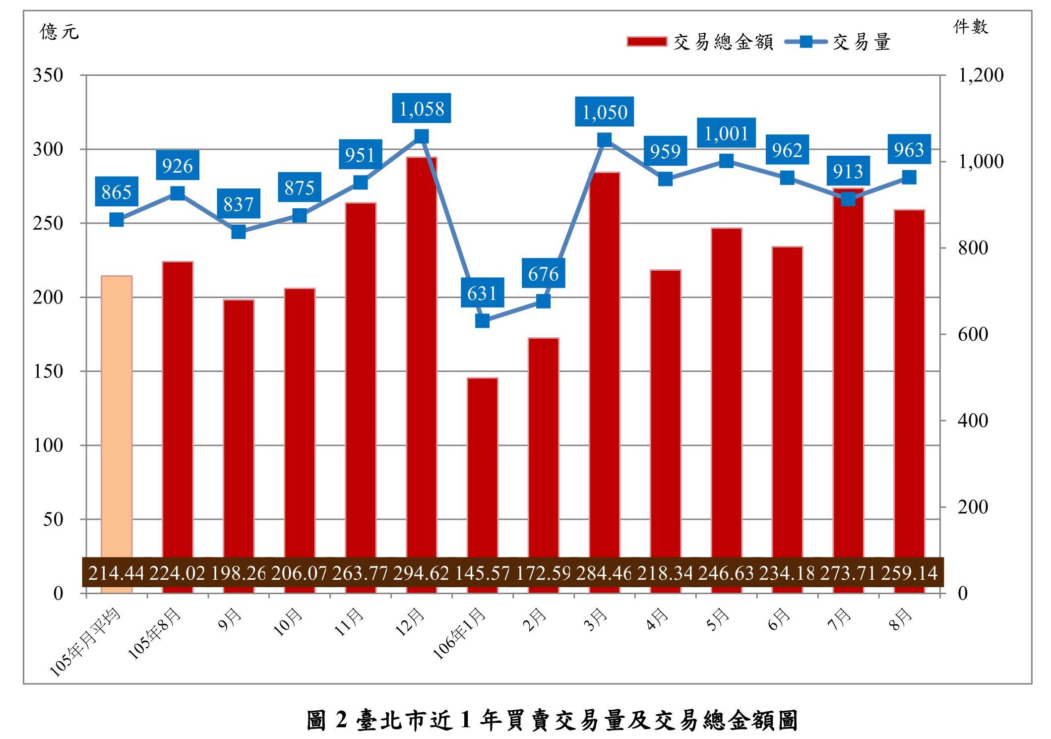 最近一期(106年8月)實價登錄量價動態,全市交易量共963件,較7月913件增加50件,增幅5.48%,較去年同期926件增加37件,增幅4.00%,較去年平均865件增加98件,增幅11.33%。交易總金額為259.14億元,較7月273.71億元減少14.57億元,減幅5.32%;較去年同期224.02億元,增加35.12億元,增幅15.68%,較去年平均214.44億元,增加44.7億元,增幅20.84% (圖2) 。