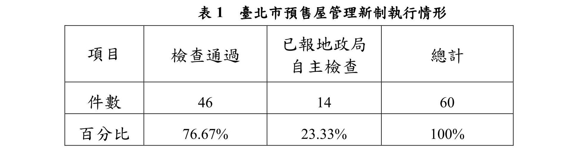 本市於今年3月1日正式推出預售屋管理新制,主要四大內容為一、自主檢查;二、公會預審;三、隨時稽查;四、即時公布。截至106年11月底止,該期間市場銷售之預售建案已全數納管(尚無未配合新制之業者) ,其中,經地政局輔導完成為46件建案,另已報請地政局自主檢查中為14件,總計納管60件建案,較上月增加10件、增幅20.0%,(表1、表2),地政局並就輔導完成建案逐案實地複查,複查結果計1件建案不合格,業已裁處新臺幣4萬元整(表3)。