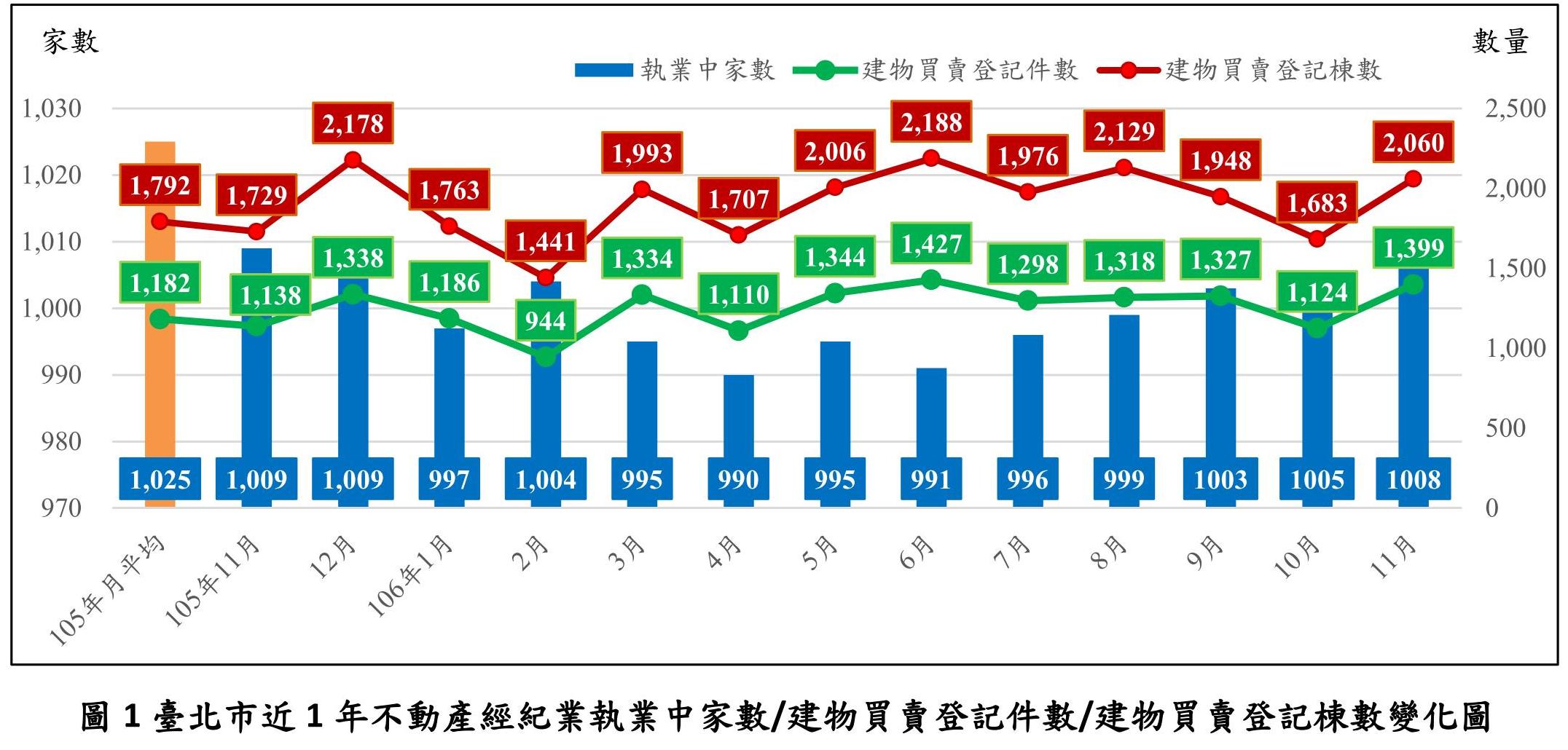 106年11月建物買賣登記件數1,399件,較上月1,124件增加275件,增幅24.47%。較去年同期1,138件增加261件,增幅22.93%,較去年平均1,182件增加217件,增幅18.36%;而建物買賣登記棟數11月2,060棟,較上月1,683棟增加377棟,增幅22.4%,較去年同期1,729棟增加331棟,增幅19.14%,較去年平均1,792棟增加268棟,增幅14.96% (圖1)。