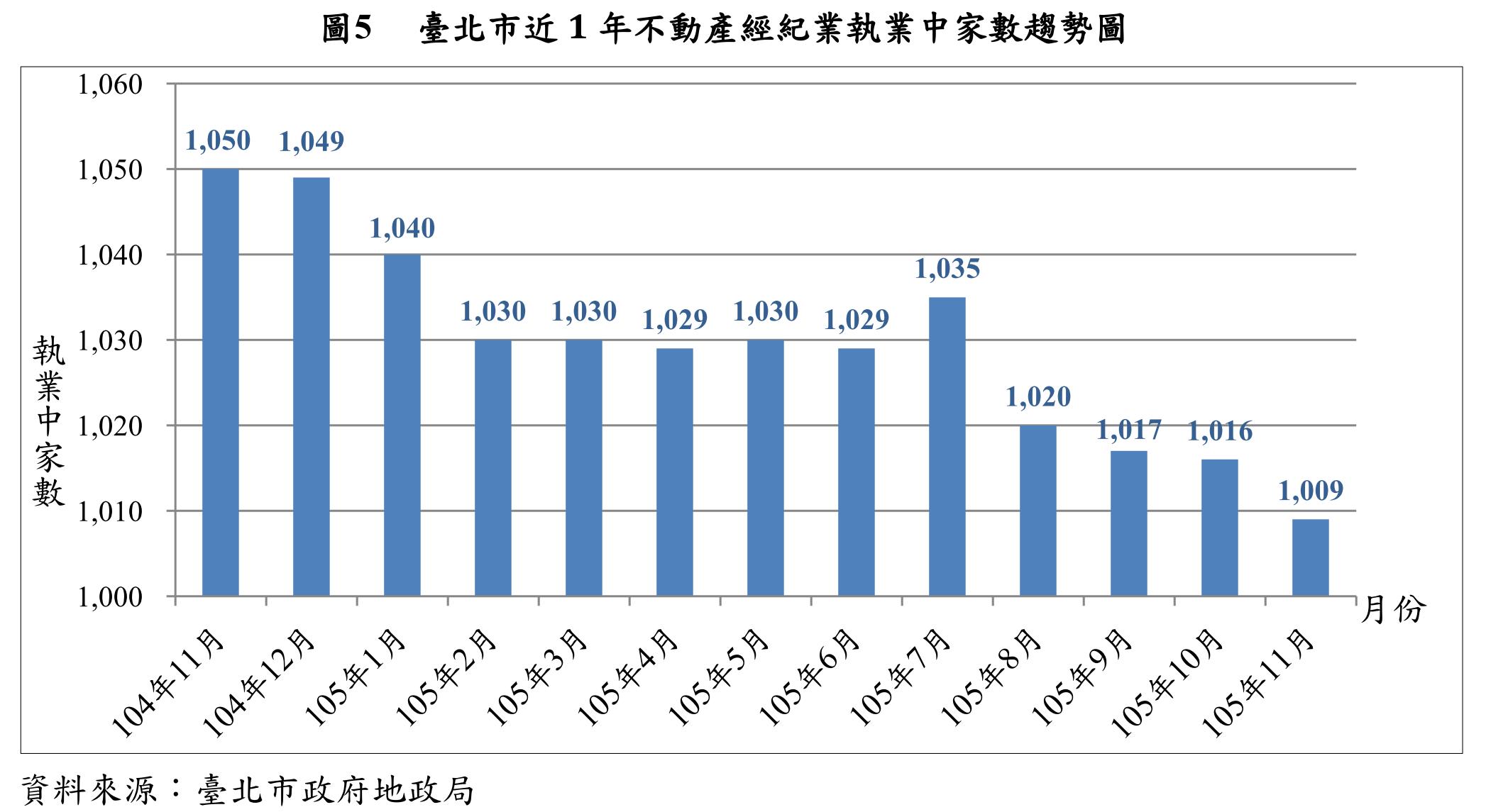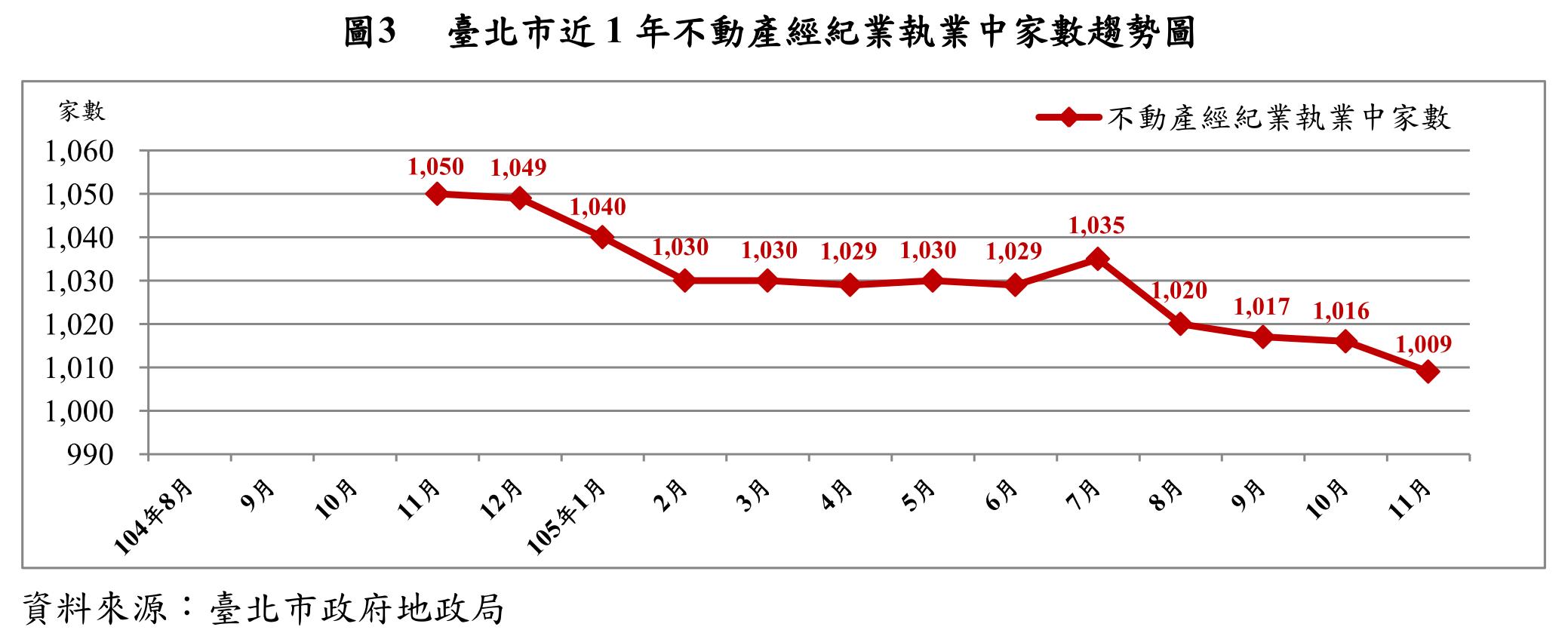 105年11月買賣案量1,618件,較上月1,643件減少25件,小幅下跌1.52%,較去年同期2,393件減少775件,減幅32.39%;而11月建物買賣登記棟數1,729棟,較上月1,773棟減少44棟,亦小幅下跌2.48%,較去年同期2,533棟減少804棟,跌幅高達31.74%。貳、 全市連續4月不動產經紀業執業中家數下降