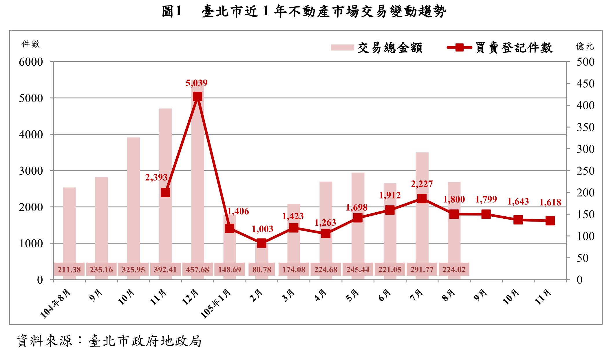 綜觀近一年不動產市場交易量價變動,105年11月買賣案量1,618件,較上月小幅下跌1.52%,較去年同期減少32.39%;不動產經紀業執業中家數連4月下降為1,009家,較上月減幅為0.7%,較去年同期減幅為3.9%。另統計最近一期(105年8月)實價登錄量價動態,全市交易量共926件,較7月小幅下跌3.14%,但較去年同期增加15.46%。交易總金額下降至224.02億元,較7月減少23.22%,但較去年同期增加5.98%;住宅價格指數110.22,較7月上漲0.66%,但較去年同期下跌5.26%。