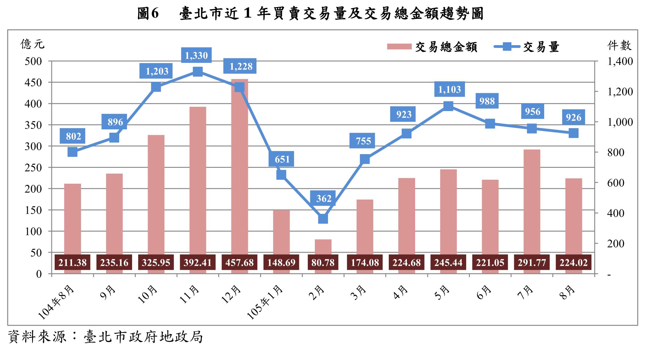 最近一期(105年8月)實價登錄量價動態,全市交易量共926件,較7月956件減少30件,減幅3.14%,但較去年同期802件增加15.46%。交易總金額224.02億元,較7月減少67.75億元,減幅為23.22%;但較去年同期211.38億元,增加12.64億元,增幅為5.98%。肆、 全市住宅價格指數上漲0.66%,大樓價格強彈公寓續弱