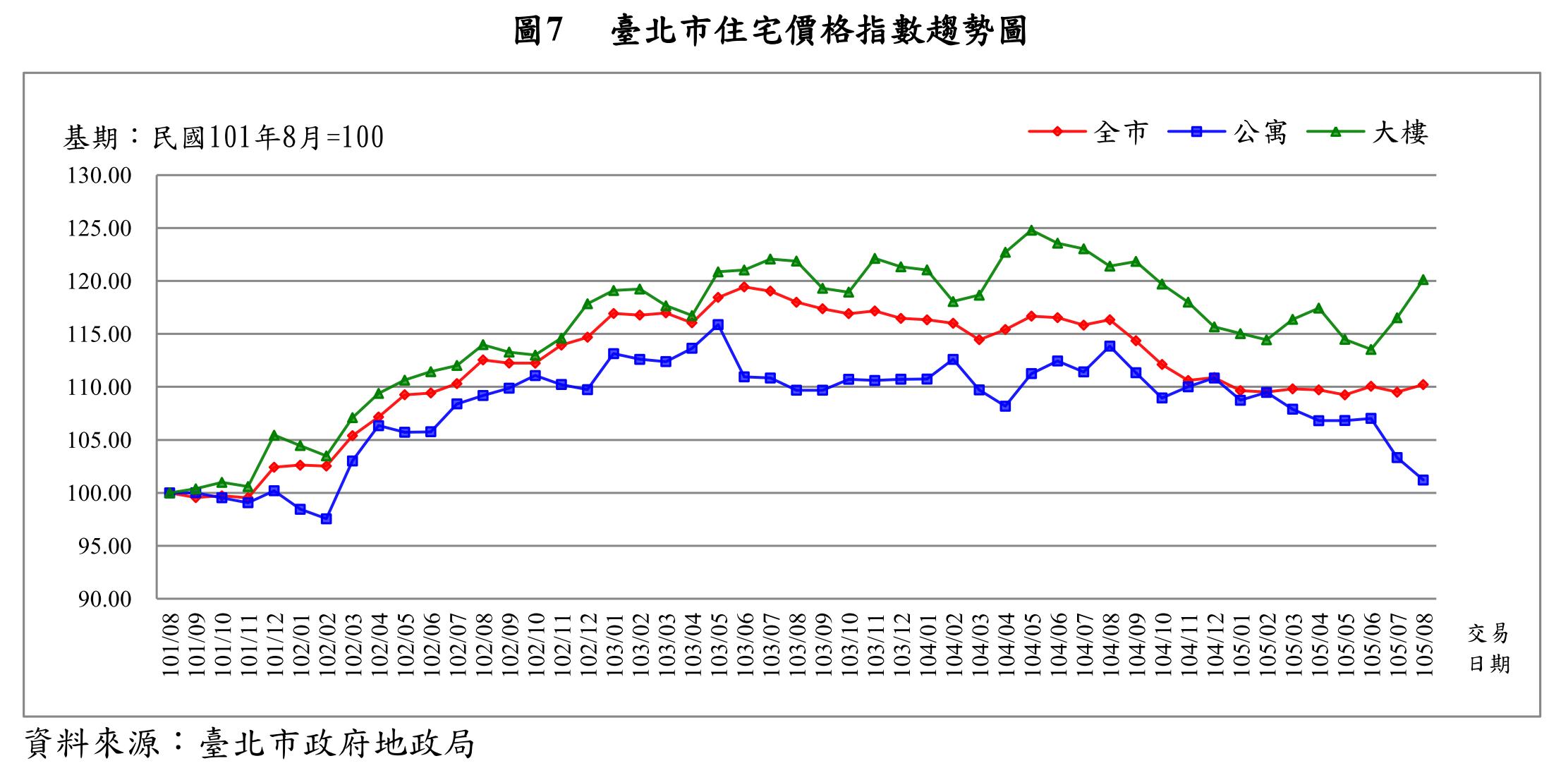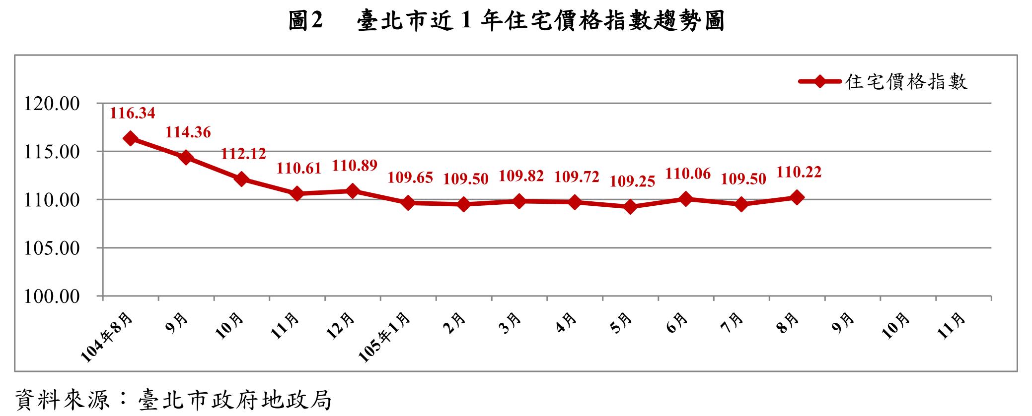 105年8月全市住宅價格指數110.22,較7月上漲0.66%,但較去年同期下跌5.26%,標準住宅總價1,379萬元,標準住宅單價每坪50.72萬元。大樓住宅價格指數120.13,較7月上漲3.09%,較去年同期下跌1.05%。公寓住宅價格指數101.21,較7月下跌2.05%,較去年同期下跌11.10%。全市近期住宅價格變動趨勢平穩,觀察大樓與公寓價格表現,大樓指數已連續2個月強勢反彈;公寓指數跌勢擴大,中、長期價格表現持續疲弱。(相關詳細內容歡迎參閱附件--臺北市不動產市場動態月報)隱私權與資訊安全政策 本站使用正體字 聯絡資訊 各科室電話 政府網站資料開放宣告