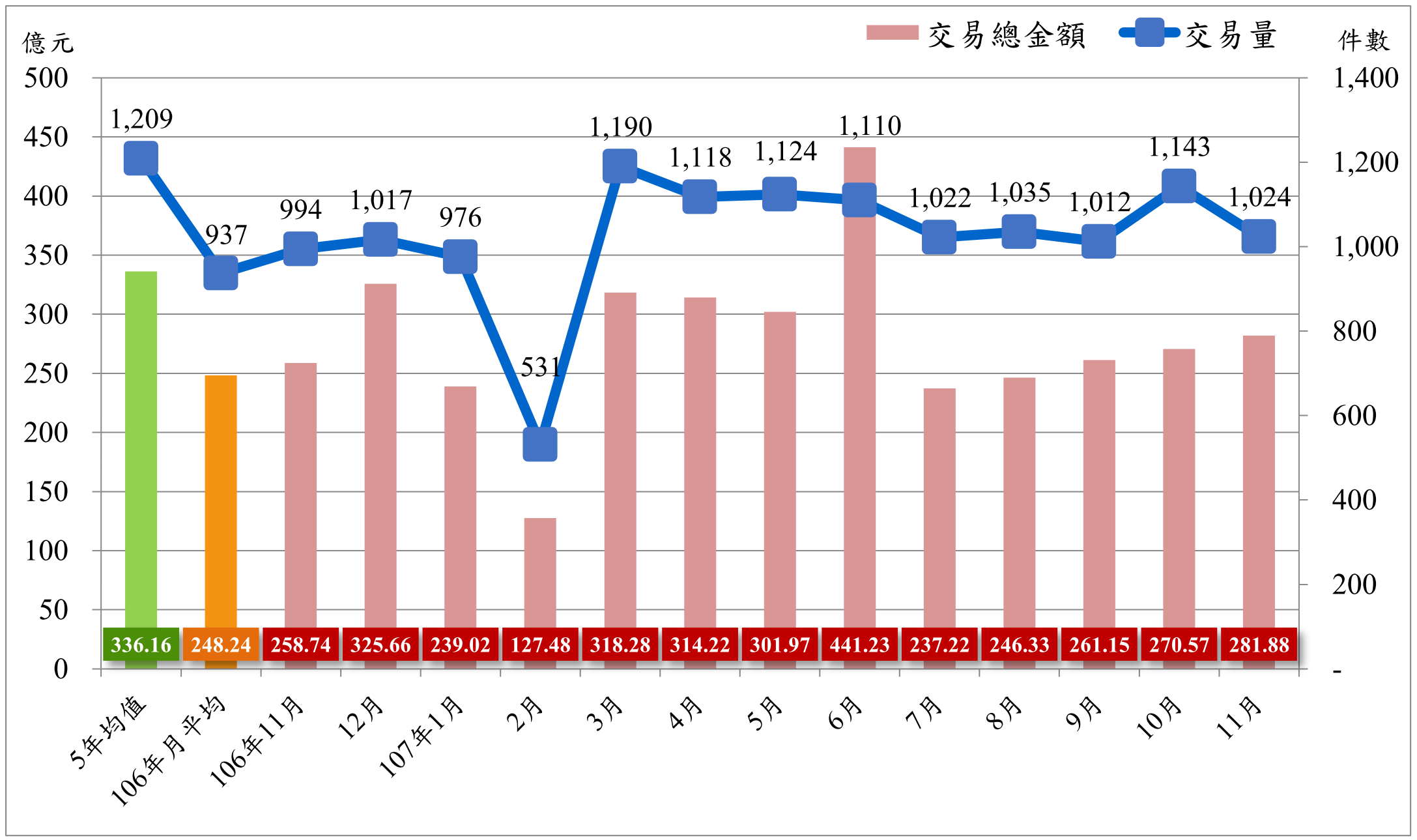 107年11月實價登錄量價動態,全市交易量共1,024件,較10月1,143件減少119件,減幅10.41%;交易總金額為281.88億元,較10月270.57億元增加11.31億元,增幅4.18%。