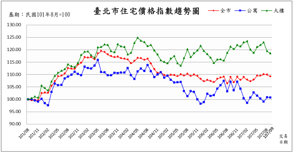 107年9月全市住宅價格指數109.20,較8月109.88下降0.62%,標準住宅總價1,366萬元,標準住宅單價每坪50.25萬元。大樓住宅價格指數118.52,較8月119.34下降0.69%;公寓住宅價格指數100.71,較8月100.77下降0.06%。
