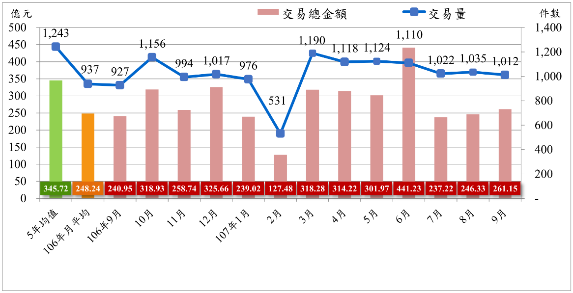 107年9月實價登錄量價動態,全市交易量共1,012件,較8月1,035件減少23件,減幅2.22%;交易總金額為261.15億元,較8月246.33億元增加14.82億元,增幅6.02%。