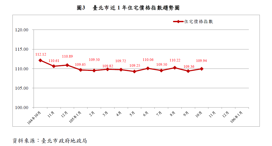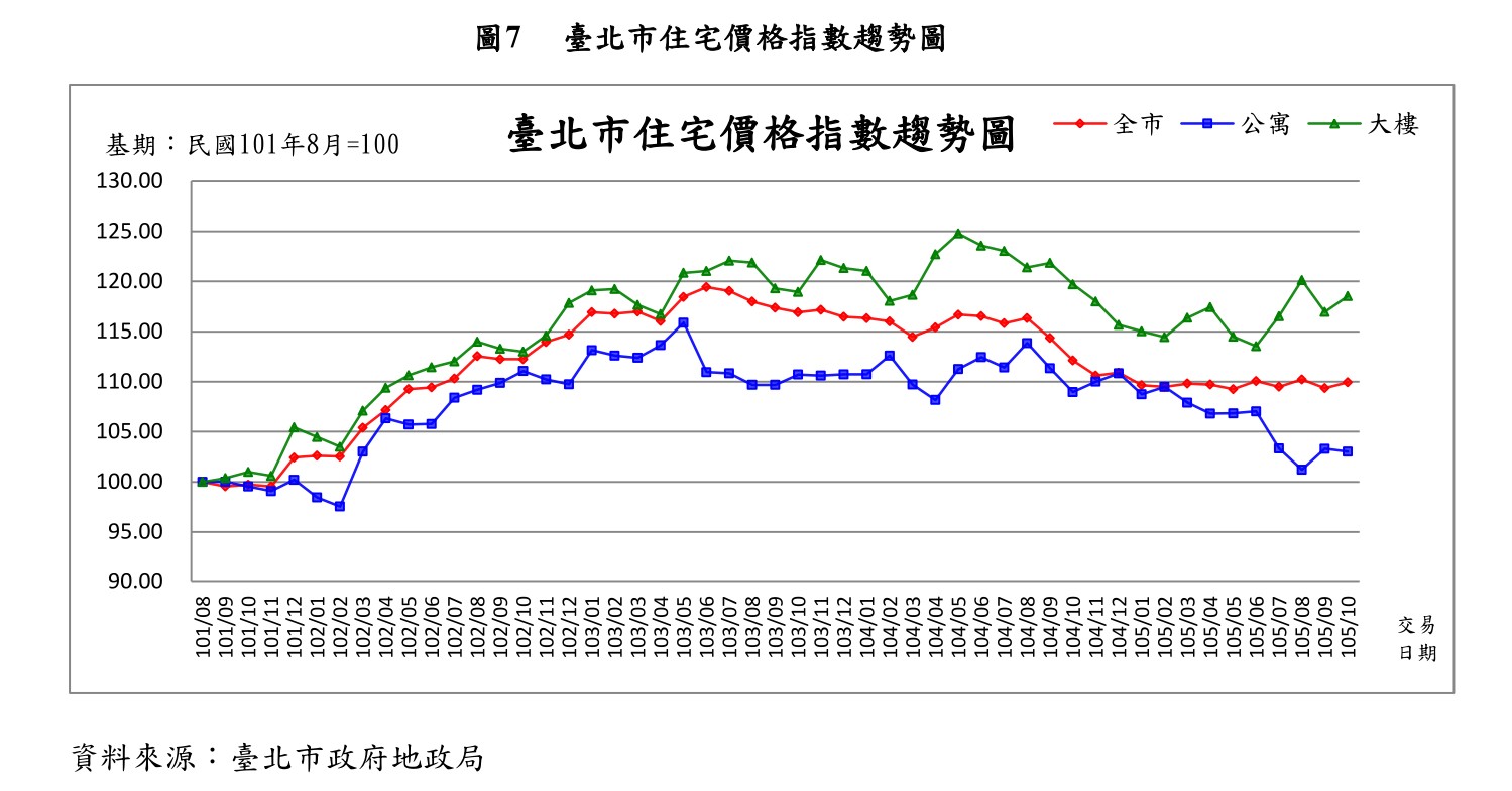 105年10月全市住宅價格指數109.94,較9月上漲0.53%,較去年同期下跌1.94%,標準住宅總價1,376萬元,標準住宅單價每坪50.59萬元。大樓住宅價格指數118.54,較9月上漲1.35%,較去年同期下跌0.98%。公寓住宅價格指數103.01,較9月下跌0.27%,較去年同期下跌5.46%。全市近期住宅價格走勢續穩,觀察大樓與公寓價格表現,公寓月線微跌,季線及半年線則已分別連續14個月及12個月走低,趨勢疲弱;大樓月線反轉回升,季線及半年線持續微揚,整體價格表現優於公寓(詳圖7)。 (相關詳細內容歡迎參閱附件--臺北市不動產市場動態月報)隱私權與資訊安全政策 本站使用正體字 聯絡資訊 各科室電話 政府網站資料開放宣告