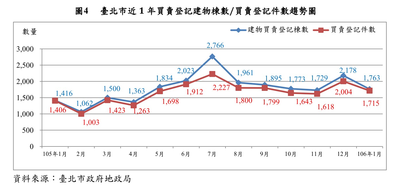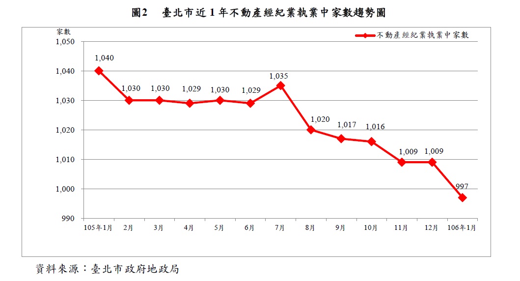 106年1月買賣案量1,715件,較上月2,004件減少289件,減幅14.42%。較去年同期1,406件增加309件,增幅21.98%。而建物買賣登記棟數1月1,763棟,較上月2,178棟減少415棟,減幅19.05%,較去年同期1,416棟增加347棟,增幅24.51%(詳圖4)。貳、 全市不動產經紀業執業中數量跌破千家