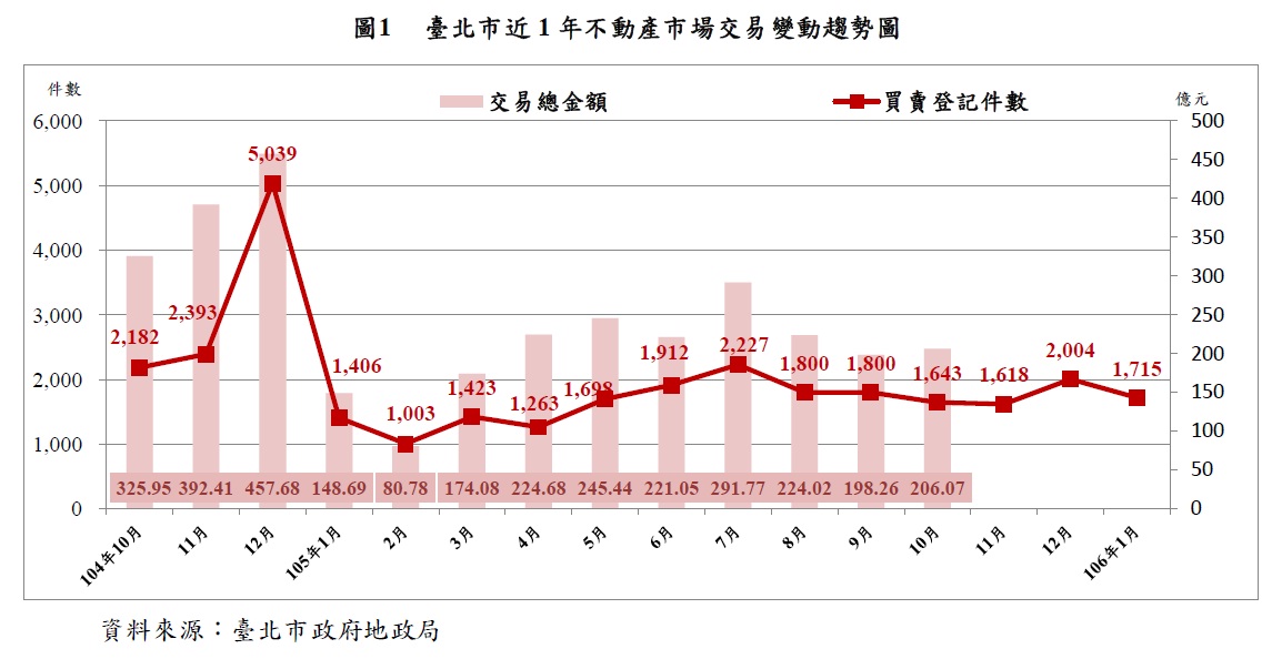 為提供更完整透明的不動產市場資訊,地政局除分析最近一期的實價登錄量價動態及住宅價格指數外,另整合全市建物買賣案量及不動產經紀業執業中家數等資料,提供更多元的不動產資訊,讓各界掌握不動產市場動態。綜觀近一年不動產市場交易量價變動,106年1月買賣案量1,715件(詳圖1),較去年12月減少14.42%,較去年同期增加21.98%;不動產經紀業執業中家數跌破千家為997家(詳圖2),較去年12月減少1.19%,較去年同期減幅為4.13%。另統計最近一期(105年10月)實價登錄量價動態,全市交易量共875件,較9月增加4.54%,較去年同期減少28.86%。交易總金額206.07億元,較9月增加3.94%,較去年同期大幅減少36.78%(詳圖6);住宅價格指數109.94(詳圖3),較9月上漲0.53%,較去年同期下跌1.94%。