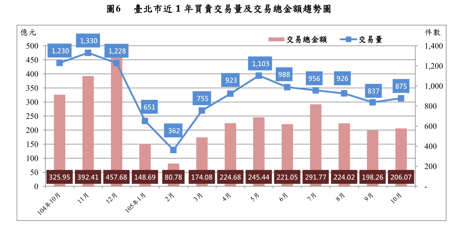 最近一期(105年10月)實價登錄量價動態,全市交易量共875件,較9月837件增加38件,增幅4.54%,較去年同期1230件減少28.86%。交易總金額206.07億元,較9月增加7.81億元,增幅為3.94%;較去年同期325.95億元,減少119.88億元,減幅達36.78%(詳圖6)。肆、 全市住宅價格指數上漲0.53%,大樓價格表現優於公寓