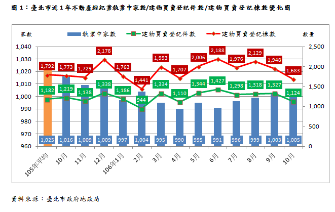 106年10月建物買賣登記件數1,124件,較上月1,327件減少203件,減幅15.30%。較去年同期1,219件減少95件,減幅7.80%,較去年平均1,182件減少58件,減幅4.91%;而建物買賣登記棟數10月1,683棟,較上月1,948棟減少265棟,減幅13.6%,較去年同期1,773棟減少90棟,減幅5.08%,較去年平均1,792件減少109棟,減幅6.08%。(詳圖1)