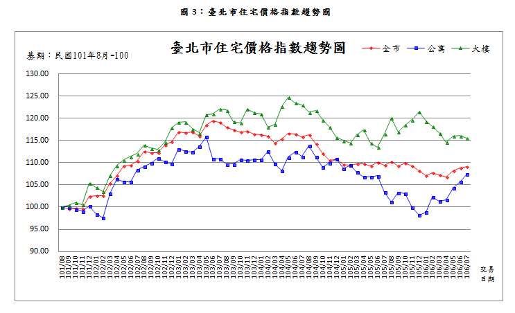 7月全市住宅價格指數109.06,較6月上漲0.29%,較去年同期(105年7月)下跌0.40%,標準住宅總價1,365萬元,標準住宅單價每坪50.19萬元。大樓住宅價格指數115.54,較6月下跌0.47%,較去年同期下跌0.85%。公寓住宅價格指數107.43,較6月上漲1.63%,較去年同期上漲3.97%(詳圖3)。