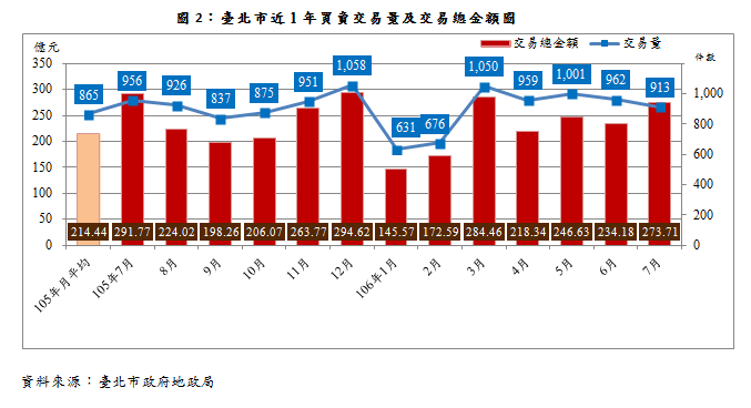 最近一期(106年7月)實價登錄量價動態,全市交易量共913件,較6月962件減少49件,減幅5.09%,較去年同期956件減少43件,減幅4.50%,較去年平均865件增加48件,增幅5.55%。交易總金額為273.71億元,較6月234.18億元增加39.53億元,增幅16.88%;較去年同期291.77億元,減少18.06億元,減幅6.19%,較去年平均214.44億元增加59.27億元,增幅27.64% (詳圖2) 。