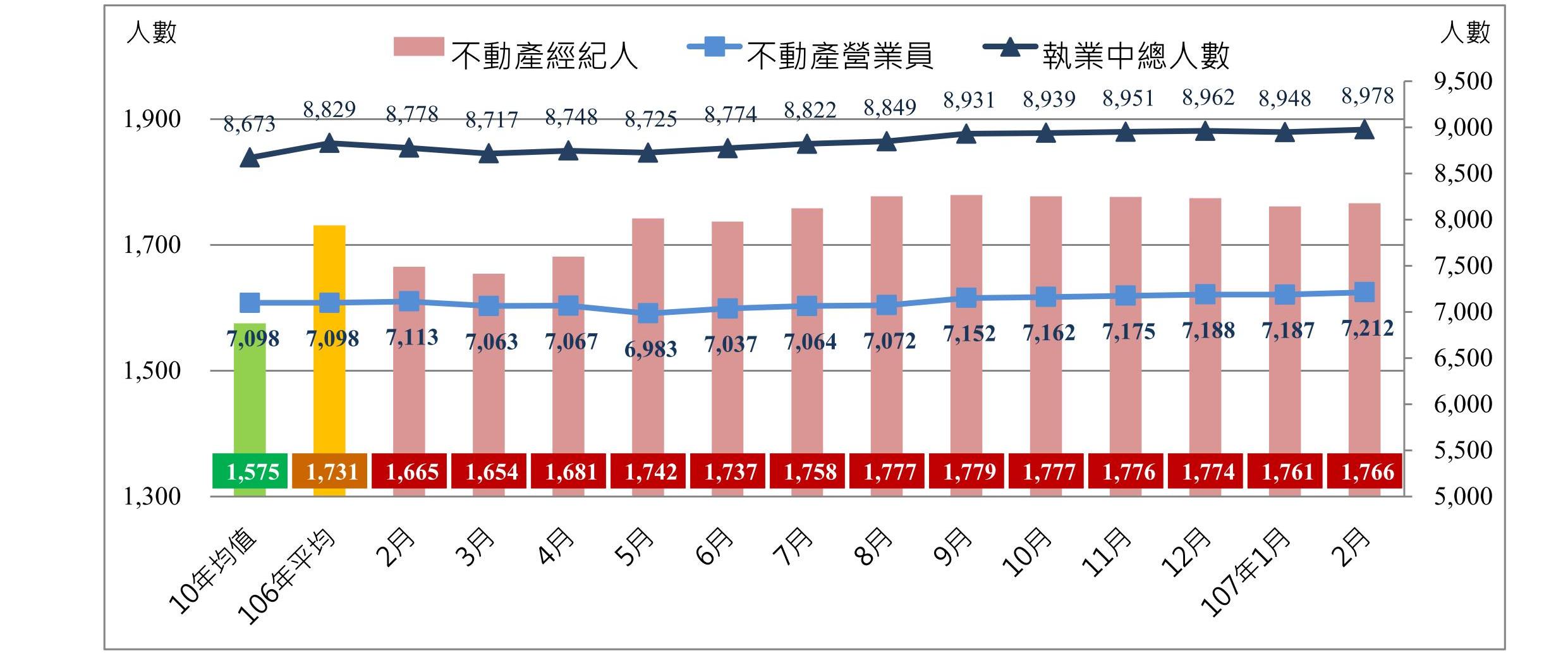 全市截至107年2月執業中經紀人員為8,978位(1,766位經紀人、7,212位營業員) ,較上月8,948位增加30位,增幅0.33%,較去年同期8,778增加200位,增幅2.27%,較去年每月平均執業中經紀人員8,829增加149位,增幅1.68%,較10年均值增加305位,增幅3.51%。又與上月執業人員情形比較,其中經紀人增加5位,營業員增加25位。與去年同期執業人員情形比較,則為經紀人增加101位,營業員增加99位(圖2)。