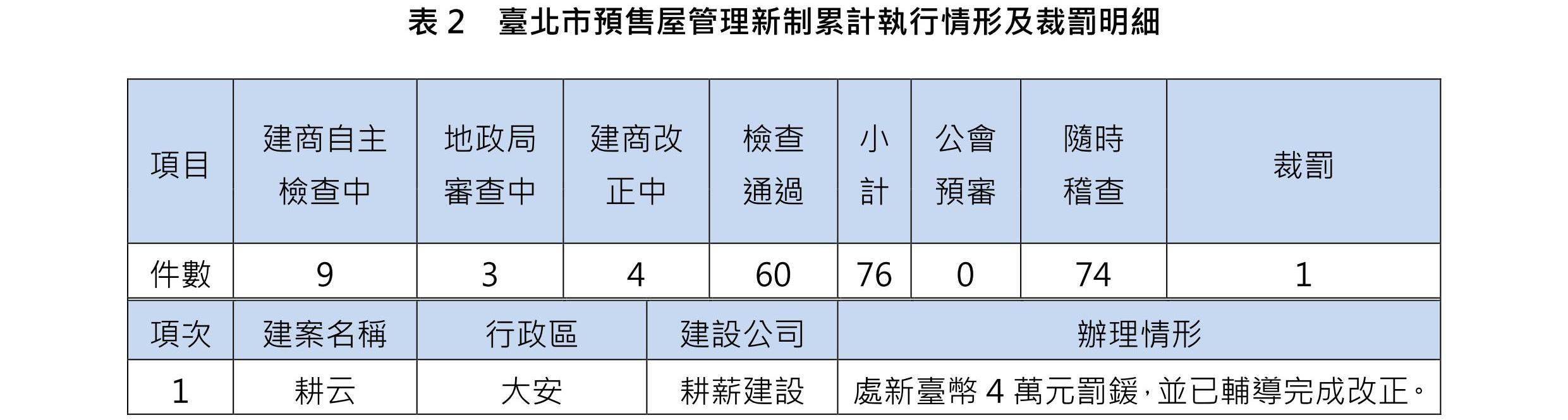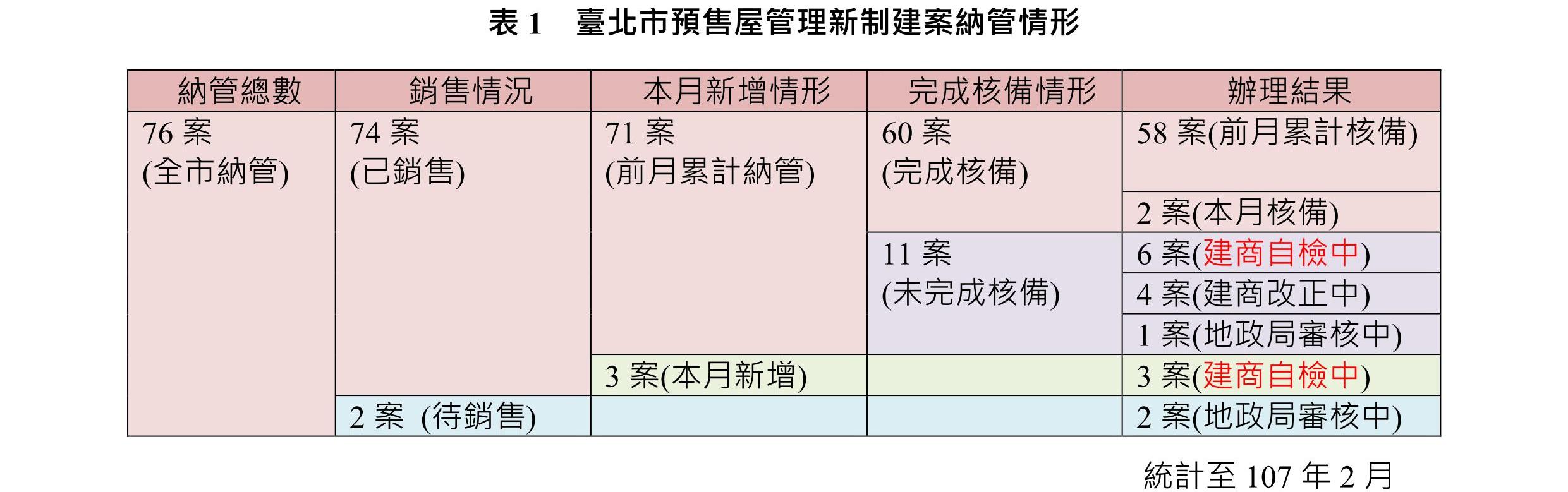 臺北市於106年3月1日正式推出預售屋管理新制,目的在納管臺北市建案契約應符合內政部公布之定型化契約應記載及不得記載事項,主要有四大內容,分別為一、自主檢查;二、公會預審;三、隨時稽查;四、即時公布。截至107年2月底止,該期間市場之預售建案契約已全數納管,包括銷售中及即將銷售之建案,共計納管76案,尚無未配合新制之業者。其中,經地政局核備完成之建案契約共計60案;未完成核備計11案(建商自主檢查中計6件,建商改正中計4件,地政局審核中1案);另本月新增3案銷售中建案,均由建商自主檢查中;新增2案即將銷售之建案,建商均已報地政局審核中(表1)。地政局並就完成核備之建案實地複查,複查結果計1件建案不合格,業已裁處新臺幣4萬元整(表2)。