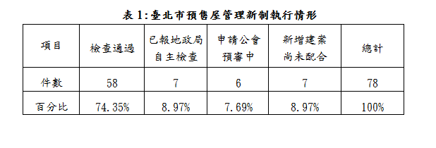 地政局已在今年3月1日正式推出預售屋管理新制,並與不動產開發公會協力推動契約預審,新制主要四大內容為一、自主檢查;二、公會預審;三、隨時稽查;四、即時公布。截至106年7月底止,該期間市場銷售之建案經地政局已列入檢查通過(含自主檢查)為58件建案,另已報請地政局自主檢查中為7件,而向公會申請預審中為6件,市場上新增銷售建案尚未配合完成新制作業共7件(已納入隨時檢查)。(詳表1)肆、4月實價登錄交易量較3月減少8.67%,交易總額同步減少23.24%