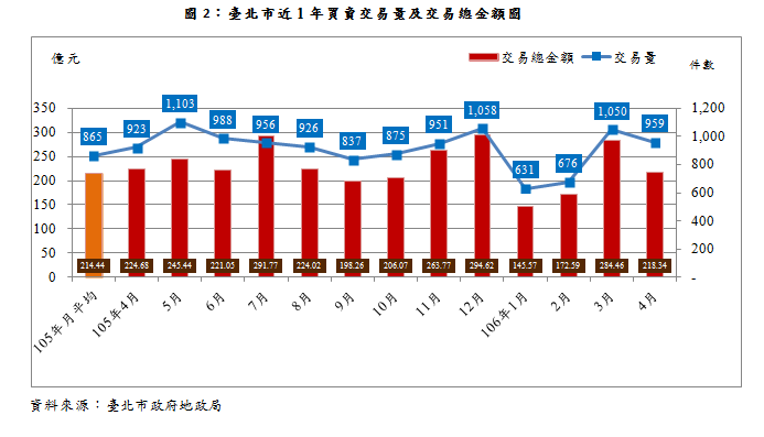 最近一期(106年4月)實價登錄量價動態,全市交易量共959件,較106年3月1,050件減少91件,減幅8.67%,較去年同期923件增加36件,增幅3.9%,較去年平均865件增加94件,增幅10.87%。交易總金額為218.34億元,較106年3月284.46億元減少66.12億元,減幅23.24%;較去年同期224.68億元,減少6.34億元,減幅2.82%,較去年平均214.44億元增加3.9億元,增幅1.82% (詳圖2) 。伍、全市住宅價格指數下跌0.42%,大樓續跌公寓仍膠著