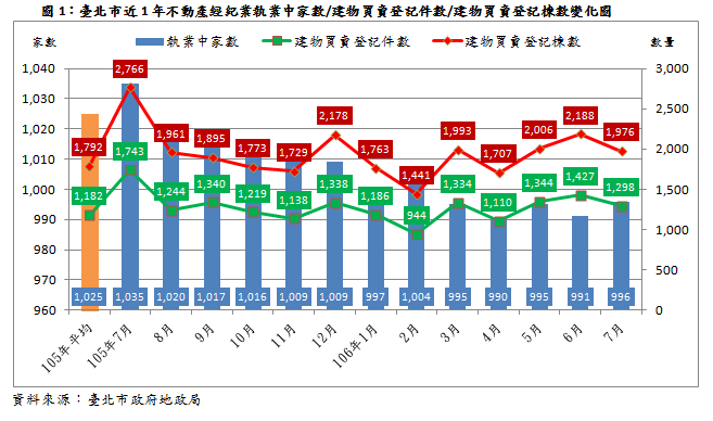 106年7月建物買賣登記件數1,298件,較上月1,427件減少129件,減幅9.04%。較去年同期1,743件減少445件,減幅25.53%,較去年平均1,182件增加116件,增幅9.81%;而建物買賣登記棟數7月1,976棟,較上月2,188棟減少212棟,減幅9.69%,較去年同期2,766棟減少790棟,減幅28.56%,較去年平均1,792件增加184棟,增幅10.27%。(詳圖1)貳、本市不動產經紀業執業中數量下降