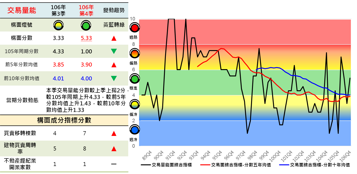 本季交易量能面由偏冷黃藍燈轉升為穩定綠燈,觀察綜合趨勢自90年至92年達到高點後即逐步下修,前5年、前10年分數均線同步走低,至105年第4季迄今,前5年分數均線小幅回升,前10年分數均線下修走勢趨緩(如圖6)。