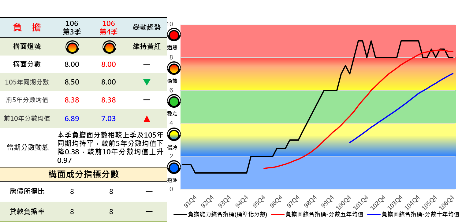 本季負擔面燈號維持偏熱黃紅燈,觀察綜合趨勢自94年一路升高,帶動前5年、前10年分數均線同步走升,至104年第3季迄今升幅始漸趨緩(如圖7)。