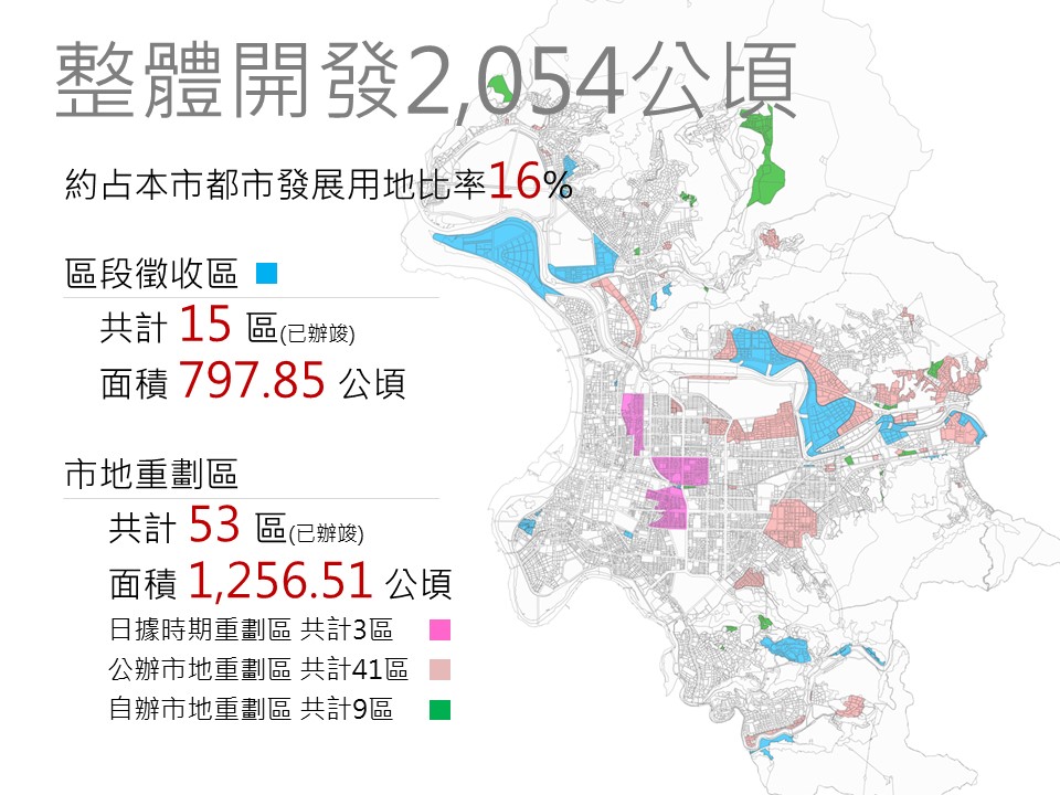 包括日據時期辦理之市地重劃區在內,臺北市已完成之整體開發區數達68區,其中區段徵收15區,面積797.85公頃;市地重劃53區,面積1256.51公頃。而近期整體開發區成果,均為實踐「開發4.0」理念的示範場域,如南港三期重劃區、文山一期重劃區及北投士林科技園區等。(智慧開發 生態臺北-盤點這些年的開發成果)
