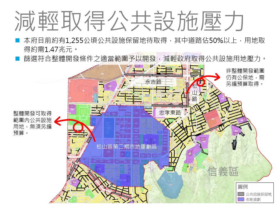 然而透過整體開發方式,可以有效減輕取得公共設施用地的財務壓力,以下圖松山二期重劃區(信義計畫區)為例,經過市地重劃整體開發後,不僅能配合區域發展策略作土地合理有效使用,亦能妥當規劃各種使用分區及取得公共設施用地,對比區外眾多待徵收的公保地(如圖中灰色區塊),其成果可見一斑。過去整體開發雖可解決公保地的問題,惟都市發展至今,未來透過跨區重劃及開發許可共同負擔公共設施仍有待各界努力。