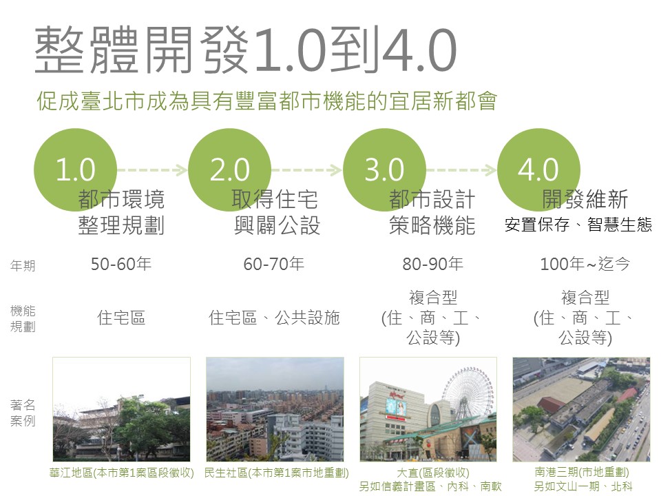 以臺北市為例,整體開發的進程可歸納為「1.0至4.0」的演變進程。整體開發1.0時期,著重的是都市環境的規劃與地籍整理,進展到2.0時期,更重視公共設施水準的提升,到了3.0時期,開發不僅是提供住宅區與公共設施用地,更有都市設計與策略機能導入,混合的土地使用型態加強支援地區產業發展或多元目標用途,而發展至今4.0時期,開發更融合智慧生態及安置保存等概念,朝永續宜居臺北城邁進。