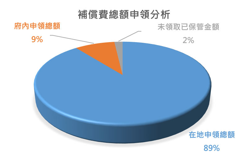 道路開闢工程徵收補償費約1,500萬元,補償費總額1,300萬元於在地申領,占總金額89%(圖三),另有130萬元為民眾自行前來臺北市政府申領。總計完成上百戶補償費發放。至於尚未領取之補償費則全數存入保管專戶,日後將會通知應受補償人前來領取保管款,民眾可於上班時間至地政局(臺北市信義區市府路1號3樓東北區,地用科)辦理申領手續,並提供到府收件、小額郵寄申請等便民服務。而應受補償人在收到通知之日起,超過15年還沒領取的補償費,將歸屬國庫。