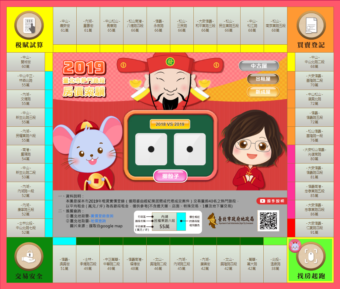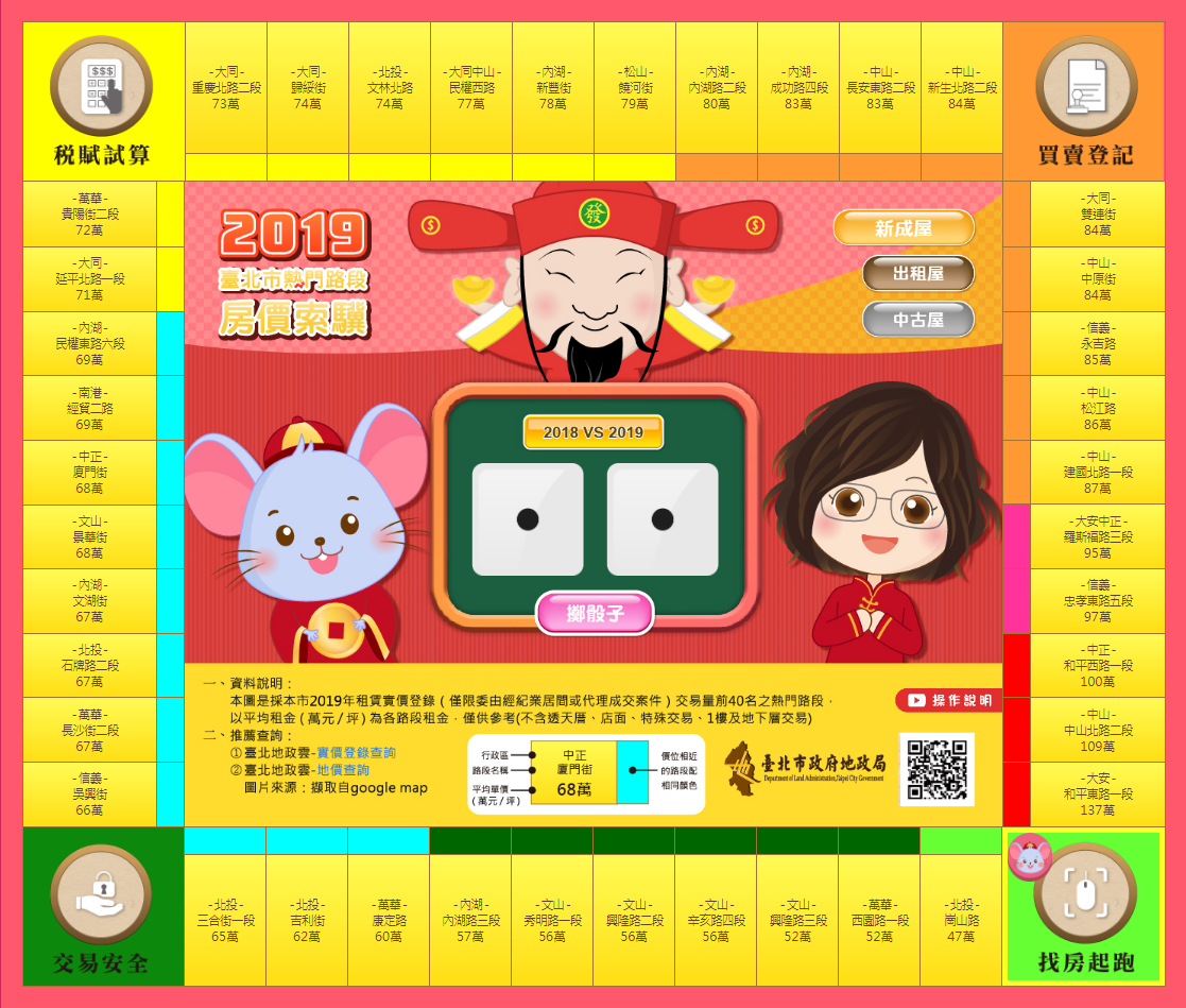 迎接新年,臺北市政府地政局再度以前一年度實價登錄案例,整理出不動產買賣及租賃交易量前40名的熱門路段,運用大富翁桌遊型式,推出「2019臺北市熱門路段房價&租金索驥」買房版-新成屋、中古屋,及租房版-出租屋三種版型,並延續臺北找房SOP的概念將買租交易相關資訊、應注意事項串聯於遊戲圖版的4個ICON中,同時納入地政局近一年房市買租交易新資訊,如實價資訊門牌區間縮小為10號、社區交易履歷棟棟都可查等,讓市民朋友新春團圓玩桌遊,輕鬆攻略北市熱門路段房價、租金行情及不動產交易大小事。