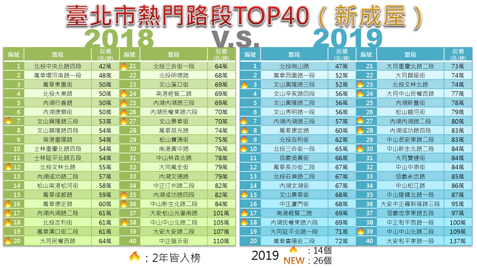 圖5:臺北市熱門路段新成屋TOP40「2018 VS 2019」比較表