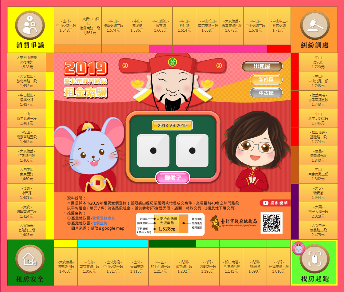 此外遊戲圖版四大ICON結合買租交易流程、應注意事項等交易相關資訊,從「找房起跑」開始了解買房、租房如何評估,並依需求分流,完全攻略租買問題,內容豐富實用。地政局推薦五大新亮點:實價資訊門牌顯示區間縮小為10號、社區交易履歷棟棟都可查、實價登錄聰明申報新攻略、登記規費線上退還及租賃服務業者成立專網等,在這裡都可以找到。讓民眾一次打包最新的房市買租價格及交易資訊,就在2019臺北市熱門路段房價&租金索驥,快上網體驗吧!