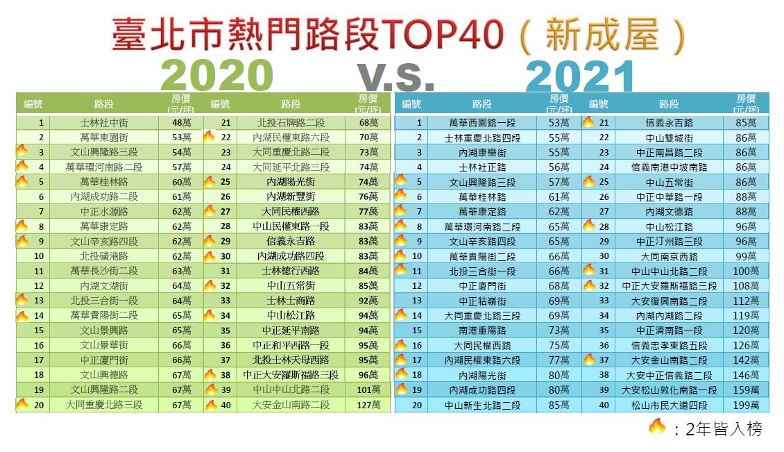 圖5:臺北市熱門路段TOP40「2020v.s.2021」比較表