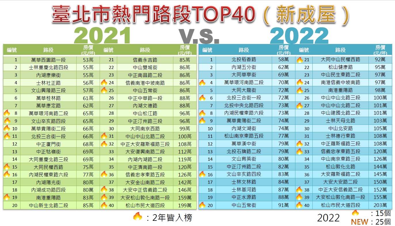 圖5:臺北市熱門路段TOP40「2021v.s.2022」比較表─新成屋