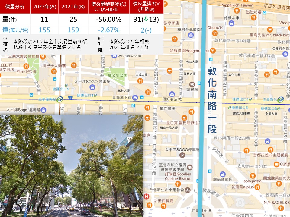 地政局針對2022年實價登錄的買賣案例,以屋齡5年為界,分別統計新成屋及中古屋交易量前40名的熱門路段,並以平均交易單價排序。除計算各路段交易量及單價,同時呈現與2021年相較之變動幅度及排名升降(詳圖1),讓市民朋友可輕鬆讀懂北市熱門交易路段近1年量價變化。
