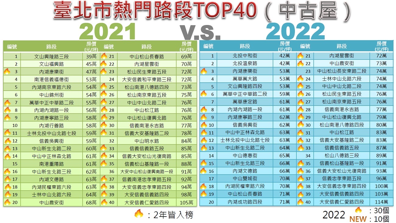 圖6:臺北市熱門路段TOP40「2021v.s.2022」比較表屋─中古屋