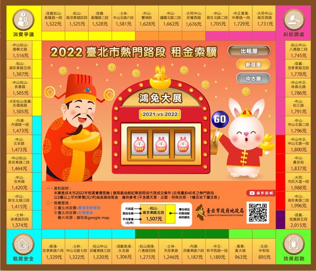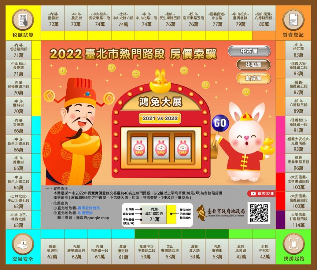 歲末年終,地政局再度為您獻上北市特製版新春桌遊。臺北市政府地政局每年會依照前一年度實價登錄案例,整理出不動產買賣及租賃交易量前40名的熱門路段,推出「買房版」新成屋、中古屋,以及「租房版」出租屋等三種版本的「2022臺北市熱門路段房價&租金索驥」大富翁桌遊,並以臺北找房SOP的概念,將買租交易流程、應注意事項等相關資訊串聯於遊戲圖版的4個ICON,同時納入地政局近一年房市交易新資訊,如臺北地政找房+「捷運房價租金地圖」新登場、「消費爭議整合查詢2.0」再升級等,讓市民朋友新春團圓玩桌遊,輕鬆攻略北市熱門路段房價、租金行情及不動產交易大小事。